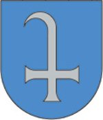 In Blau ein silbernes Kreuz, dessen oberer Arm verlängert und zu einer stilisierten Krümme rechtshin ausgezogen ist.