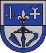 In von Silber und Blau geteiltem Schildrand, oben 2:1 vorne ein silbernes Kreuz, dessen oberer Arm verlängert und zu einer stilisierten Krümme rechtshin ausgezogen ist, hinten ein silbernes Kreuz, dessen oberer Arm in einer liegenden Mondsichel endet, darunter eine silberne Lilie, unten eine blaue Armbrust, rechts beseitet von einer schräggestellten blauen Pfugschar, links von einem schräggestellten blauen Rebmesser.