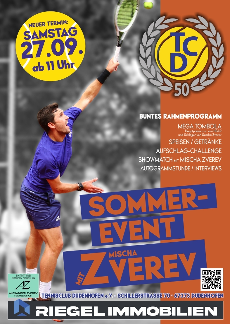 am 27. September 2025 verwandelt sich die Anlage des TC Dudenhofen, der in diesem Jahr sein 50- jähriges Jubiläum feiert, ab 11:00 Uhr in eine Bühne für Spitzentennis und abwechslungsreiche Unterhaltung. Der ehemalige Tennisprofi Mischa Zverev, älterer Bruder von Alexander Zverev, macht im Rahmen seines Projekts „Tennis in kleinen Vereinen groß machen“ Station beim TCD. Die Aktion ist Teil einer bundesweiten Initiative, mit der Mischa Zverev gezielt kleinere Tennisvereine unter- stützt und neue Impulse für den Tennissport setzt.