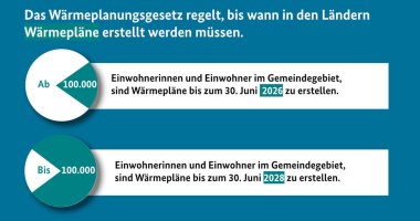 Das Wärmeplanungsgesetz schafft die rechtliche Grundlage für die verbindliche und flächendeckende Einführung der Wärmeplanung. Für Gemeindegebiete mit mehr als 100.000 Einwohnern muss bis zum Juni 2026 ein Wärmeplan erstellt werden. Für Gemeindegebiete mit bis zu 100.000 Einwohnern ist dafür Zeit bis zum 30. Juni 2028. Für die Einwohnerzahl gilt der Stichtag 1. Januar 2024. (Quelle: BMWSB)